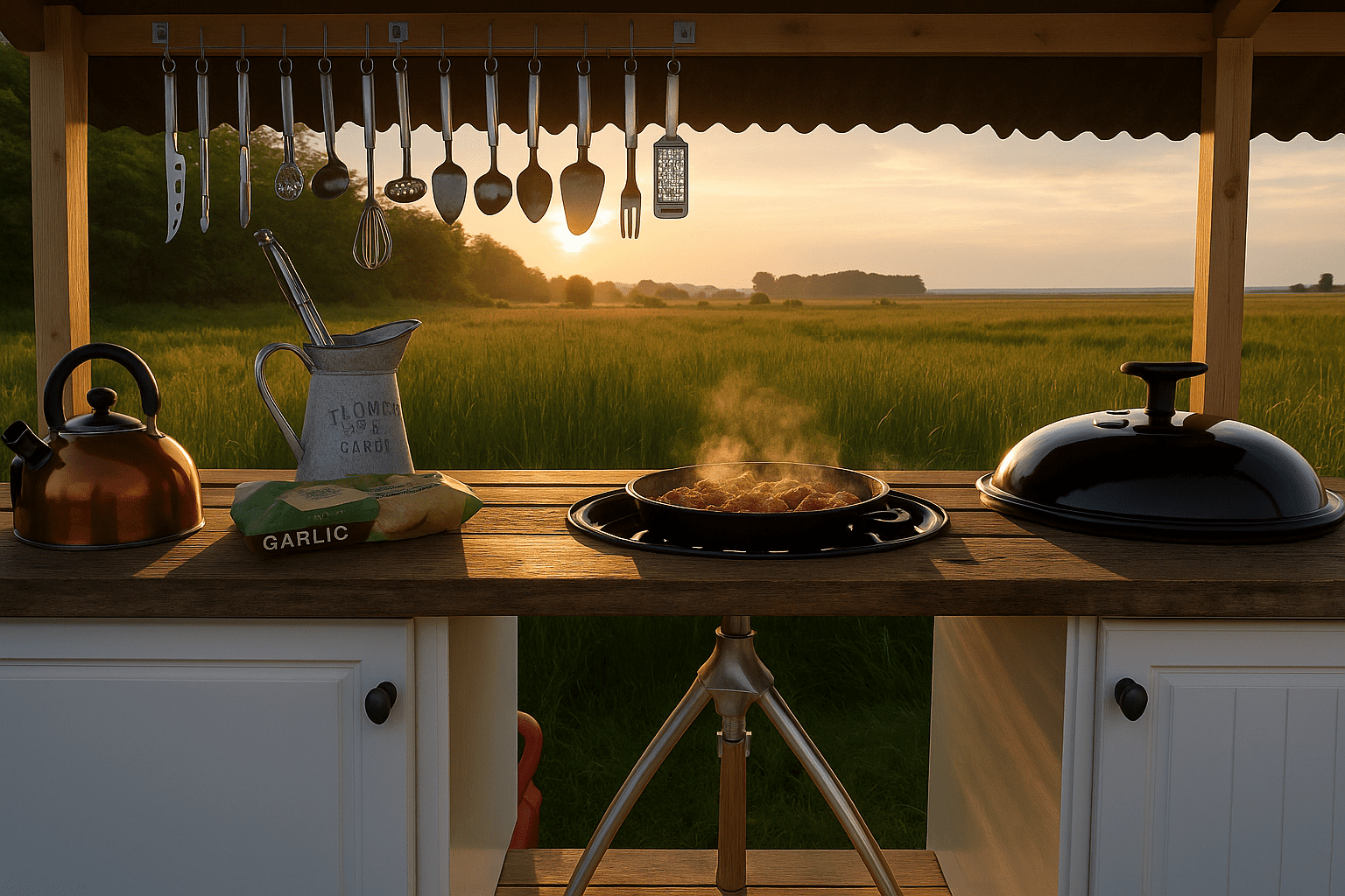 Enjoy an outdoor kitchen with gas BBQ, pots, pans, and utensils — everything you need to prepare and share meals surrounded by nature.